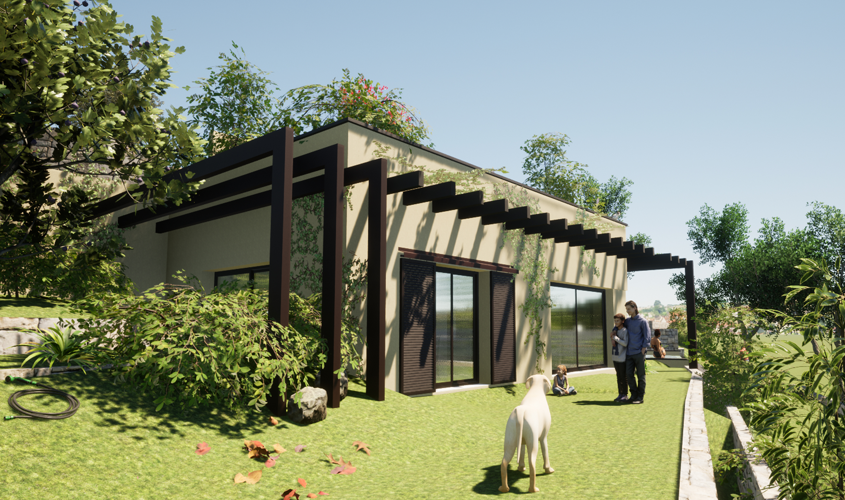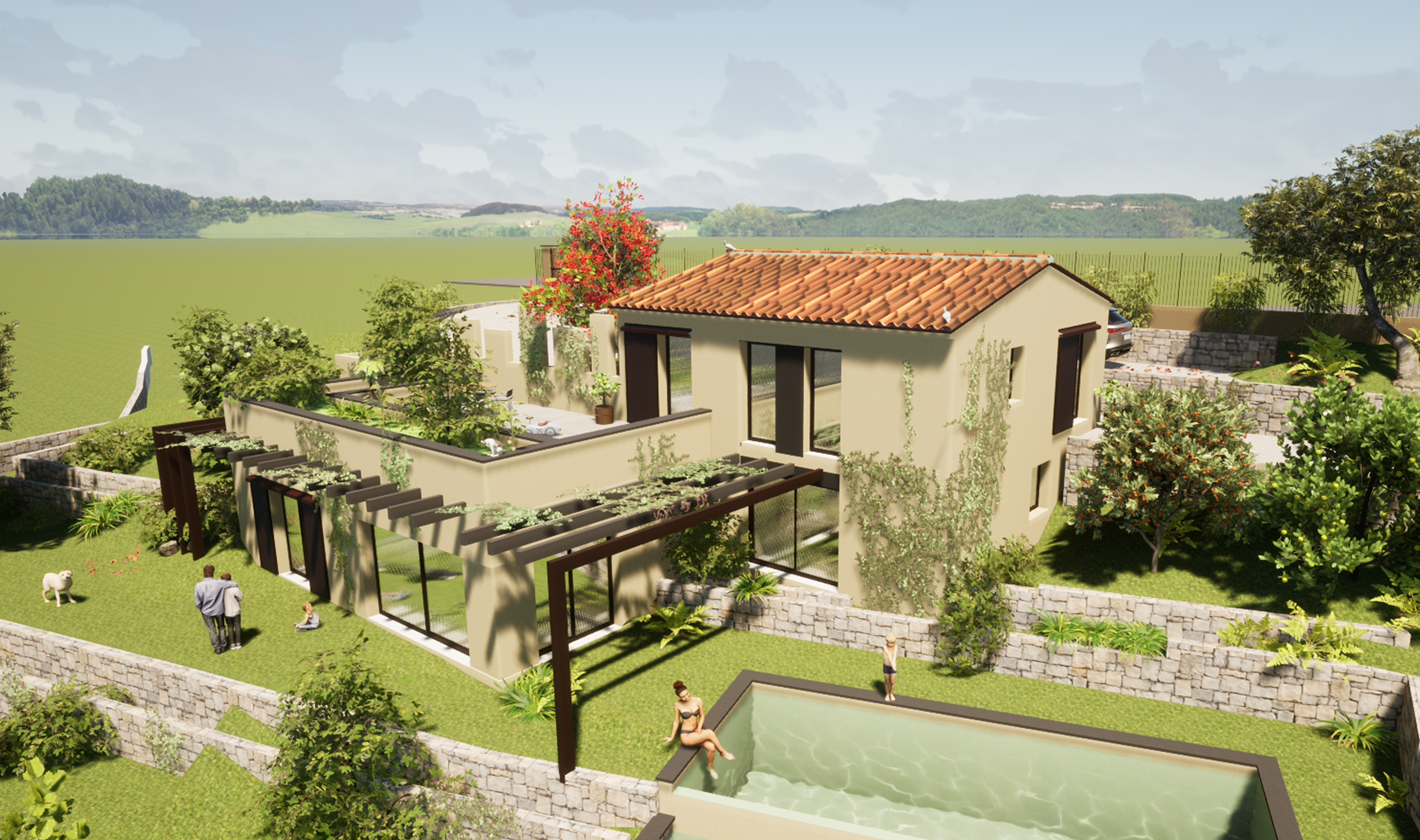 Implanté à Opio, ce projet s’inscrit dans un terrain en pente, dont il épouse la topographie pour en révéler tout le potentiel. La maison s’articule en deux volumes reliés, offrant une organisation spatiale fluide et des façades uniques sur chaque face, pensées en fonction des vues, de la lumière et de la relation au paysage.