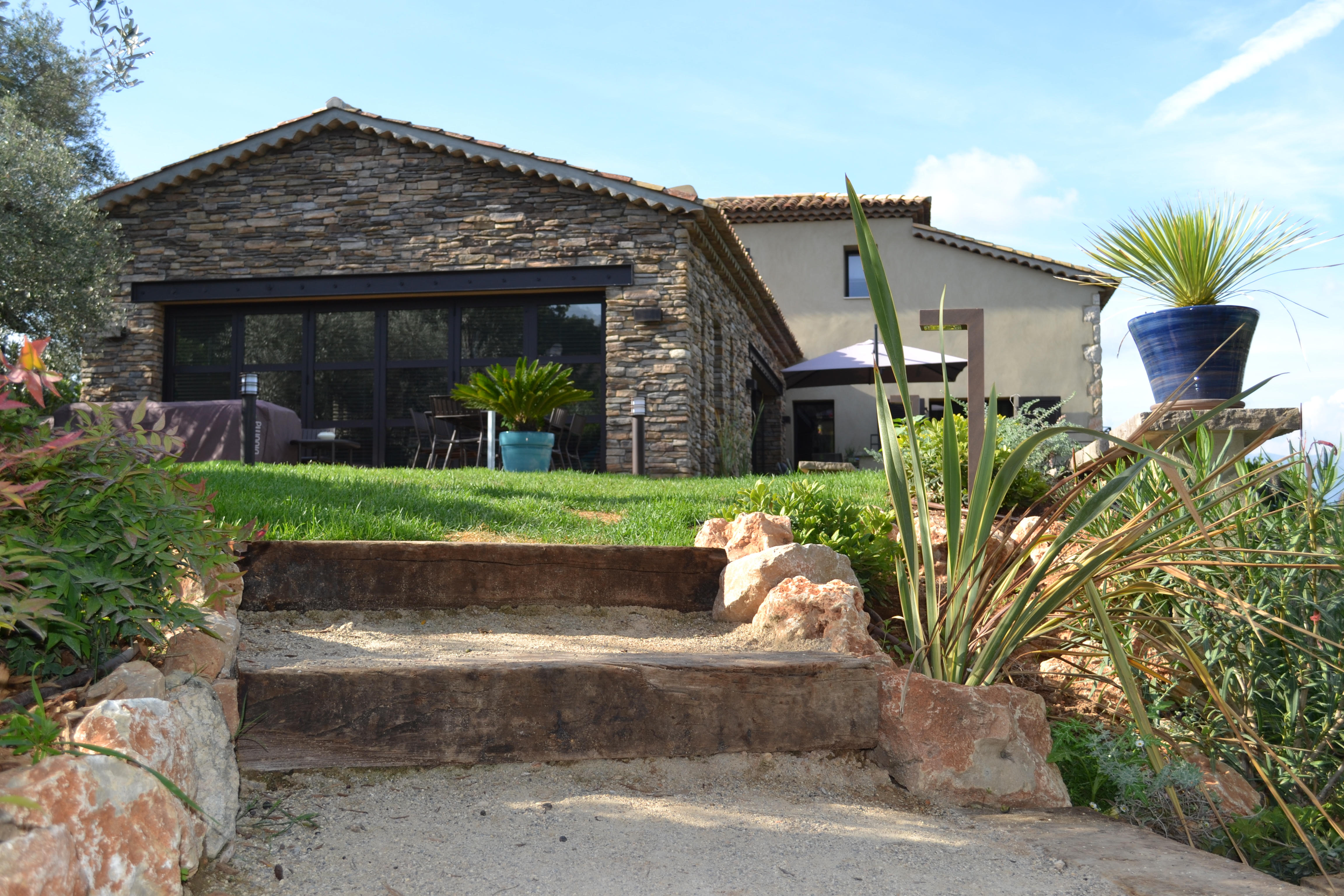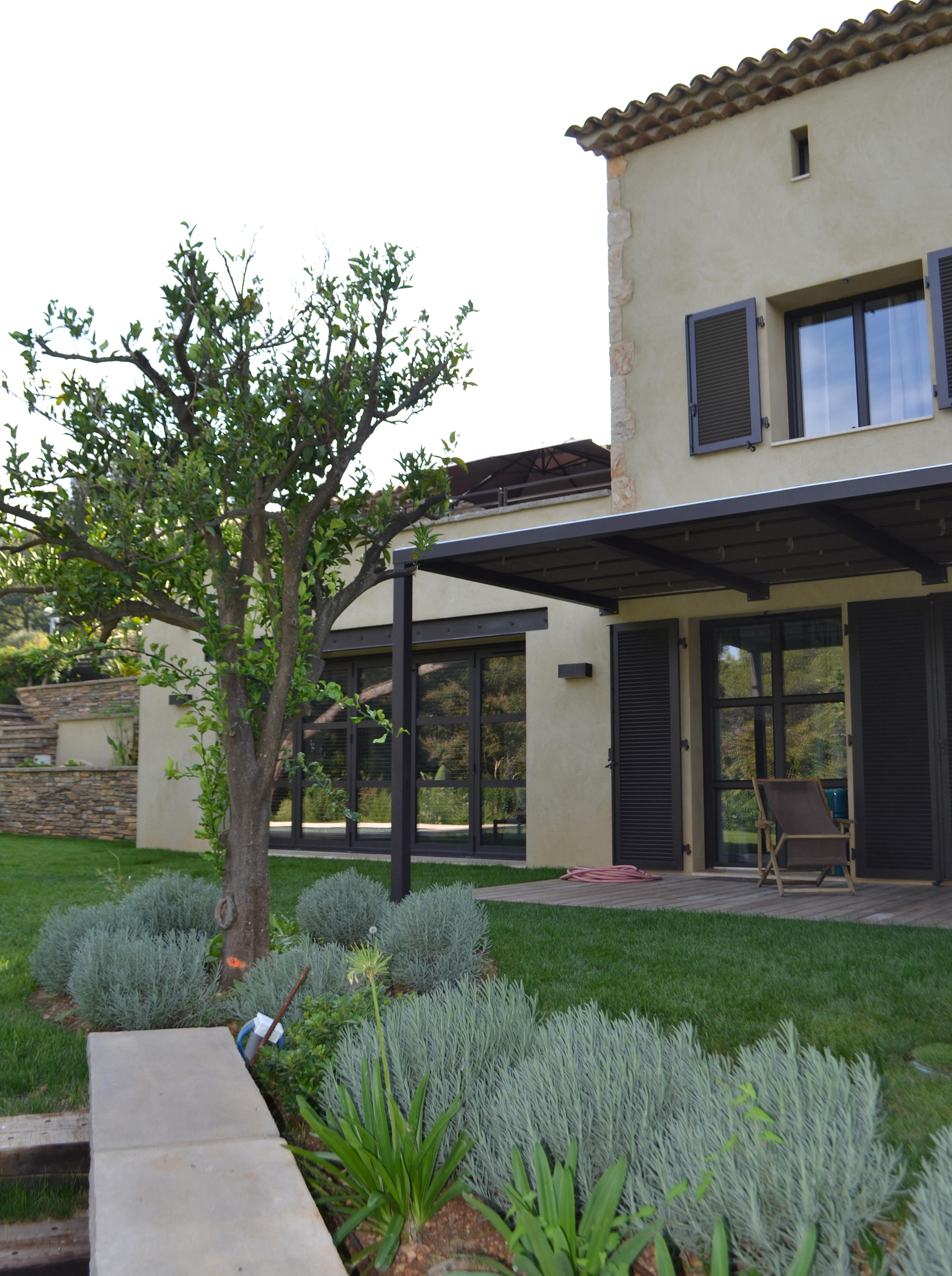 lignes contemporaines et touches provençales avec des matériaux d’œuvre choisis pour leur justesse et leur pérennité, à l’intérieur comme à l’extérieur. De larges ouvertures laissent entrer la lumière et prolongent les vues sur le paysage.
