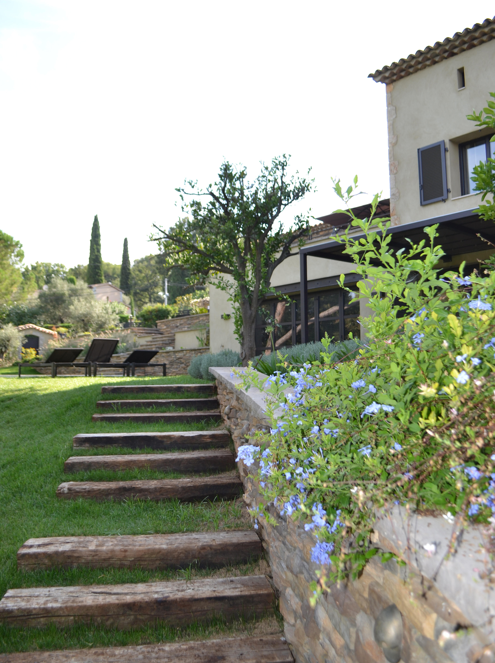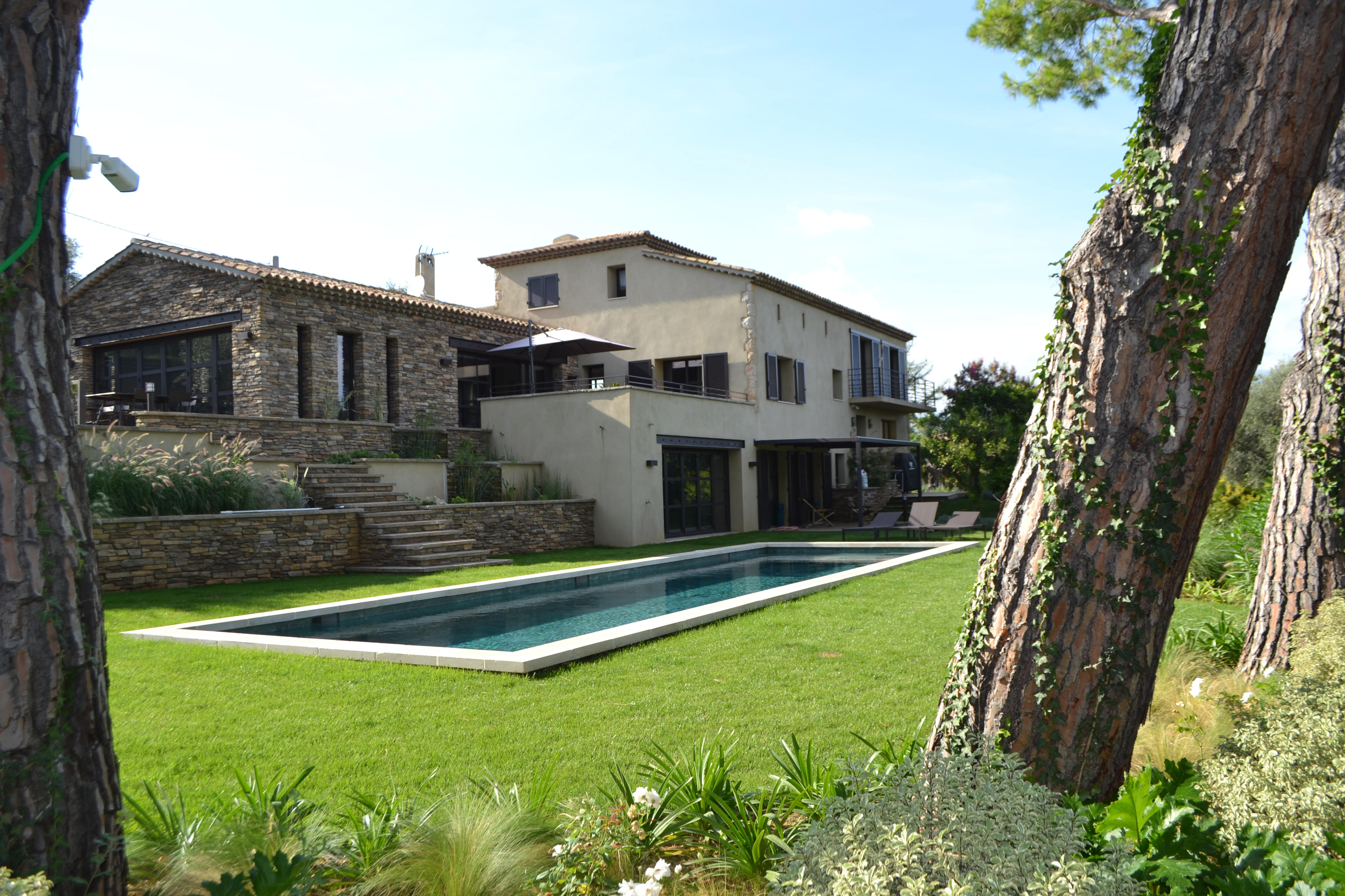 À Biot, cette villa s’enracine dans la pente du terrain, articulée par une succession de niveaux qui accompagnent naturellement le relief. Le jardin, généreux et structuré, déploie de grands espaces ouverts, ponctués de restanques et de cheminements doux.