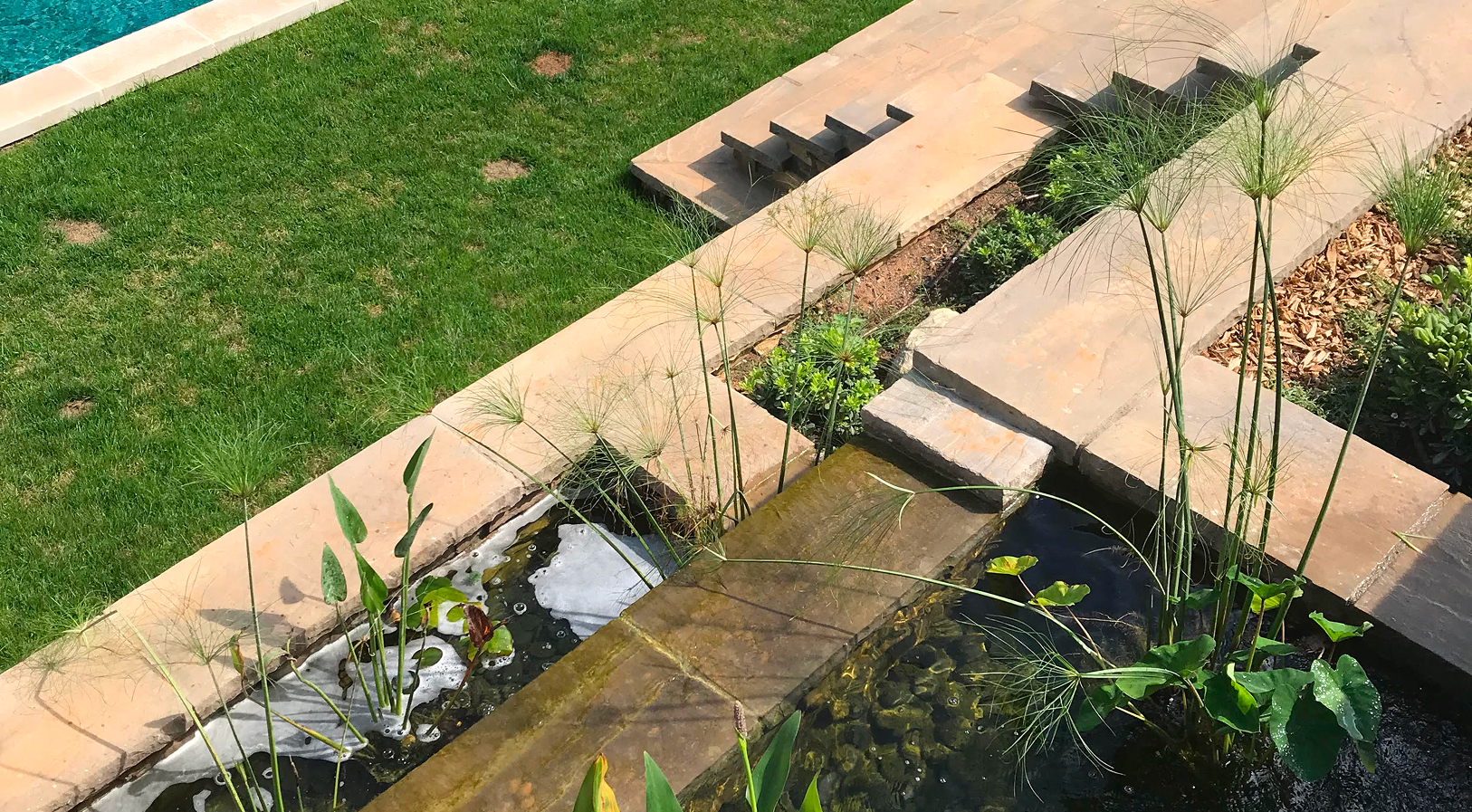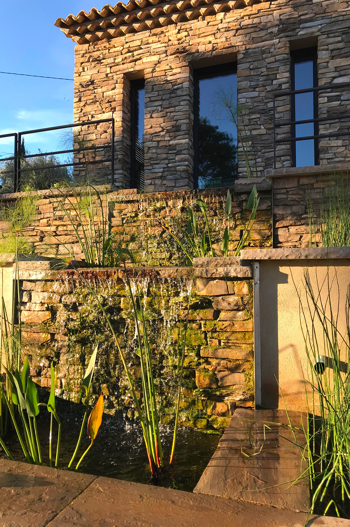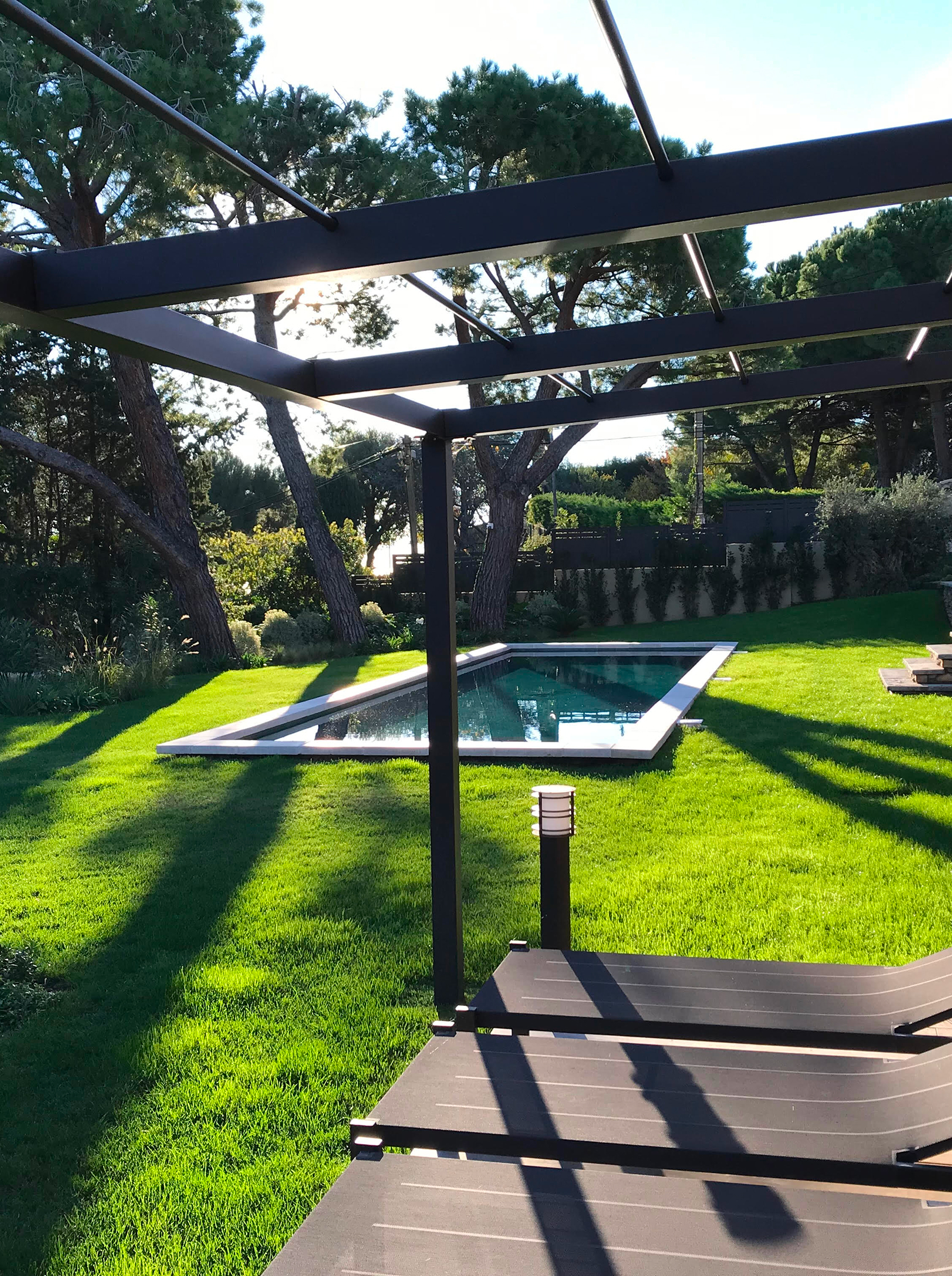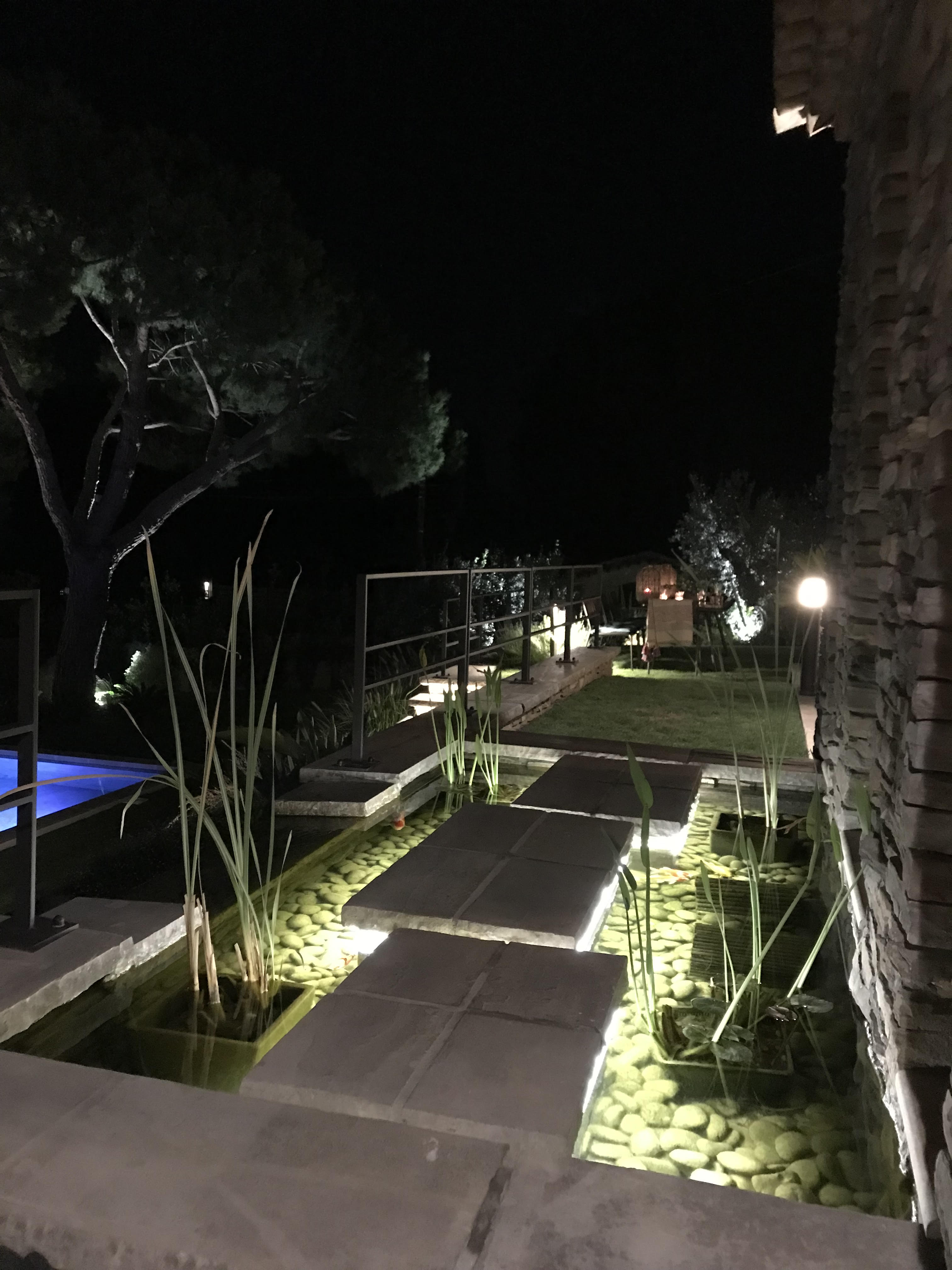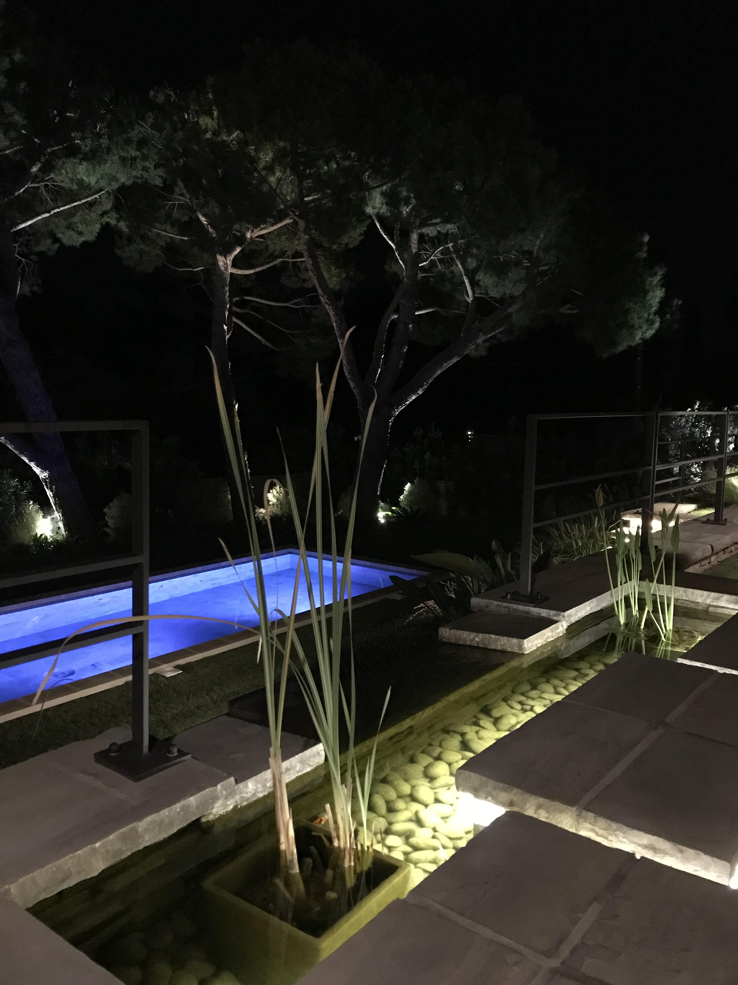 En contrebas, une piscine s’étire en fond de parcelle, tandis qu’une série de bassins en cascade rythme la descente, apportant fraîcheur, reflets et quiétude. L’architecture mêle
